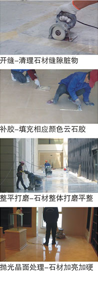 1、打蠟、拋光石材是一種天然、環保的裝飾材料,其色彩亮麗、豪華氣派,所以對其的保養尤為重要。打蠟就是密封石材表面的一些用肉眼看不到的細小孔洞,防止受到灰塵的污染和污漬的滲透,從而延長其使用壽命。(1)清洗地面使用多功能洗地機,配合吸塵吸水機及洗石水等清潔工具和藥劑進行清洗。(2)打蠟使用專業打蠟機配合高級石材護理蠟對石材進行打蠟處理。(3)拋光使用高速拋光機進行拋光,以達到光潔、亮麗的效果。2、石材病變處理石材的主要病變為油漬、水漬、咖啡漬等有色污漬滲入石材所產生的病變,對其病變的處理,是使用專業進口藥劑去除污漬,從而使石材恢復本色。